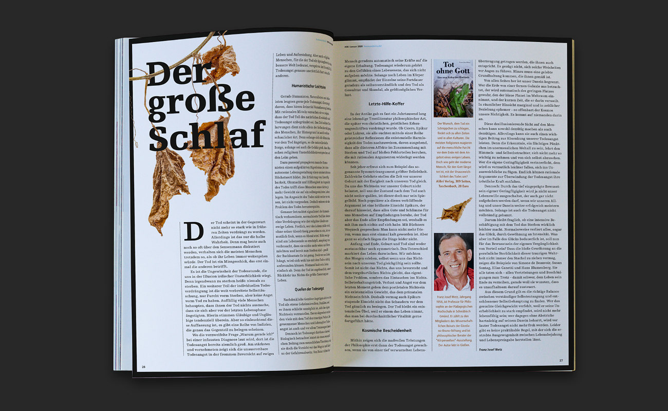 Das Sprachrohr der Humanistischen Gemeinschaft zeigt mit Artikeln, Berichten, Kommentaren und Interviews, wie vielfältig humanistisches Engagement in Deutschland und in der Welt aussieht. Für das vierteljährlich erscheinende Magazin übernahm ich die komplette Design-Entwicklung und kümmere mich seitdem um die Gestaltung der aktuellen Ausgaben inklusive Bildredaktion, Illustration und Infografiken.