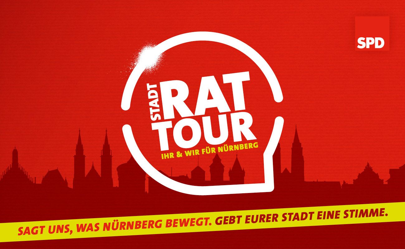 Während der Legislaturperiode Flagge zeigen, auf die Wähler zugehen und sie nach ihren Eindrücken und Wünschen fragen, das war das Ziel der erfolgreichen „StadtRatTour“ der SPD Stadtratsfraktion durch die Stadtteile Nürnbergs. Geteasert durch Abreißzettel, angekündigt mit Plakaten und Großflächen. Individualisierte Botschaften spielten bei den Werbemitteln eine wichtige Rolle. Infobroschüre und Türhänger erhielten einen persönlichen Anstrich: Tourende Stadträte klebten ihre individuellen Sticker auf, wurden so zu direkten Ansprechpartnern – der schnelle Draht zum Stadtrat.
