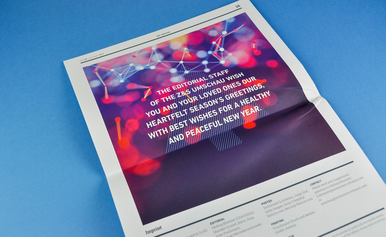 Das Mitarbeitermagazin „Umschau“ der Zschimmer & Schwarz-Gruppe hält die internationale Belegschaft des Unternehmens regelmäßig auf dem neuesten Stand, was sich im Unternehmen so tut. Dabei ist alles geboten, von Strategiekonzept bis Suppenrezept – „Umschau“ bietet eben Rundumblick. Damit die Botschaft auch überall ankommt, wird das Heft auf Deutsch und Englisch publiziert.